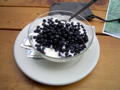 Bergbauernjogurt mit Blaubeeren serviert auf der Maurerberghütte