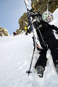 Da geht es zur Sache. Die Ski am ABS-Rucksack und am Stahlseil hinauf zur Geißlehnscharte.