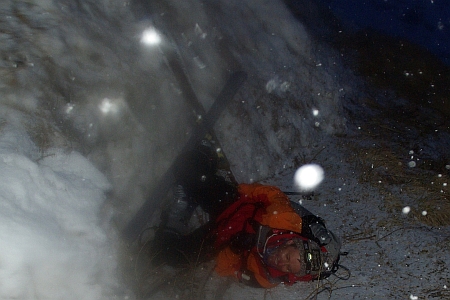 | So hatte Wolfi noch Glück im Unglück als er bei der Querung eines Lawinenkegels stürzte und sich nicht verletzte. Wie ein auf dem Rücken liegender Maikäfer lag er in der Dämmerung und bat um Unterstützung beim Aufstehen - gerne doch. |