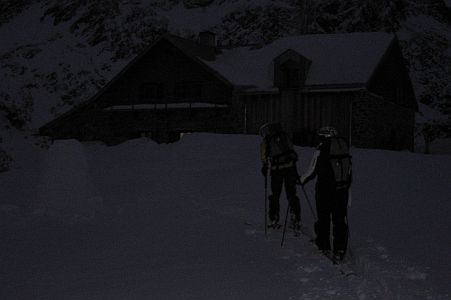 Das Ende der ersten gemeinsamen Etappe, die Winnebachseehütte bei Abenddämmerung.
